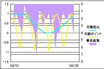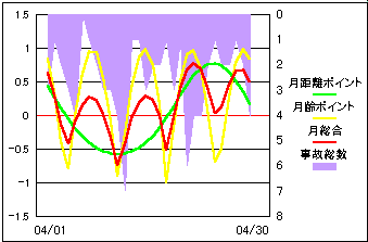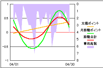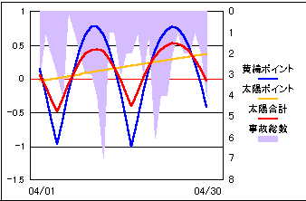 事故総発生件数と太陽地心距離・黄経度差を比較。