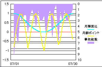 事故総発生件数と月の輝面比と月齢から比較