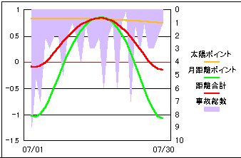 事故総発生件数と月と太陽の距離変化を比較