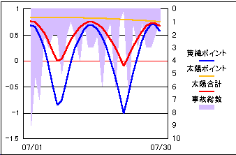 事故総発生件数と太陽地心距離・黄経度差を比較。