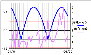 太陽と月の黄緯差を数値化したポイントと比較。 上旬と中旬過ぎに黄緯が一致しています。 このグラフからは、殆ど関連が見られません。 |