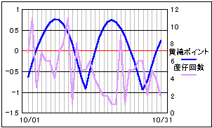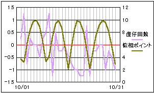 当サイトの危険度グラフの算出項目の変更から、今月分から当ページでも月齢ポイントを位相ポイントに変更しました。 基本的には月齢の1/4周期毎に数値化したポイント値と変わりません。 より輝面比(満ち欠けの様子に)忠実になります。 大まかに4つの谷と一致しているようにも見えますが、はっきりとした影響は現れていないようです。 |