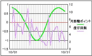 太陽と月の黄緯差を数値化したポイントと比較。 高緯度の差が少ないときに産仔数も減少しているようにも見えます。 やはり、単一要素だけでは明確な相関は見られないようです。 |