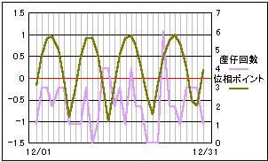 当サイトの危険度グラフの算出項目の変更から、10月分から当ページでも月齢ポイントを位相ポイントに変更しました。 基本的には月齢の1/4周期毎に数値化したポイント値と変わりません。 より輝面比(満ち欠けの様子)に忠実になります。 大まかに4つの谷と一致しているようにも見えますが、はっきりとした影響は現れていないようです。 |