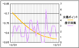 太陽と月の黄緯差を数値化したポイントと比較。 高緯度の差が少ないときに産仔回数も減少しているようにも見えます。 やはり、単一要素だけでは明確な相関は見られないようです。 |