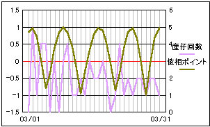 当サイトの危険度グラフの算出項目の変更から、昨年10月分から当ページでも月齢ポイントを位相ポイントに変更しました。 基本的には月齢の1/4周期毎に数値化したポイント値と変わりません。 より輝面比(満ち欠けの様子)に忠実になります。 大まかに4つの谷と一致しているようにも見えますが、はっきりとした影響は現れていないようです。 |