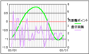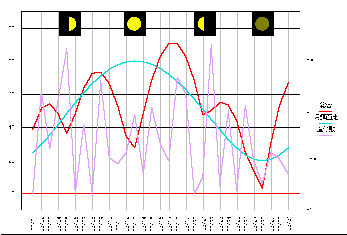 太陽と月の黄緯差を数値化したポイントと比較。 高緯度の差が少ないときに産仔回数も減少しているようにも見えます。 やはり、単一要素だけでは明確な相関は見られないようです。 |