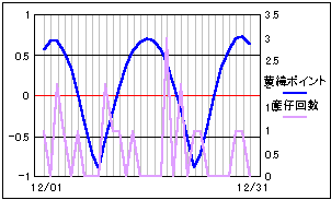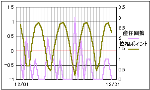 当サイトの危険度グラフの算出項目の変更から、昨年10月分から当ページでも月齢ポイントを位相ポイントに変更しました。 基本的には月齢の1/4周期毎に数値化したポイント値と変わりません。 より輝面比(満ち欠けの様子)に忠実になります。 大まかに4つの谷と一致しているようにも見えますが、はっきりとした影響は現れていないようです。 | |