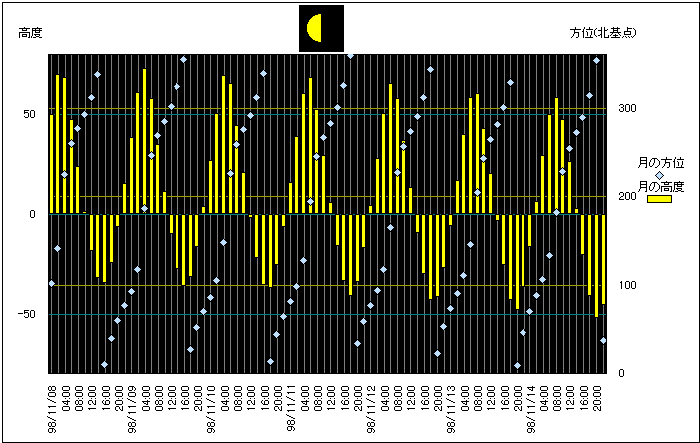 ![]() | 任意日時で月齢や月と太陽の位置や距離を算出します。 | |
