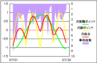 事故総発生件数と太陽地心距離・黄経度差を比較。
