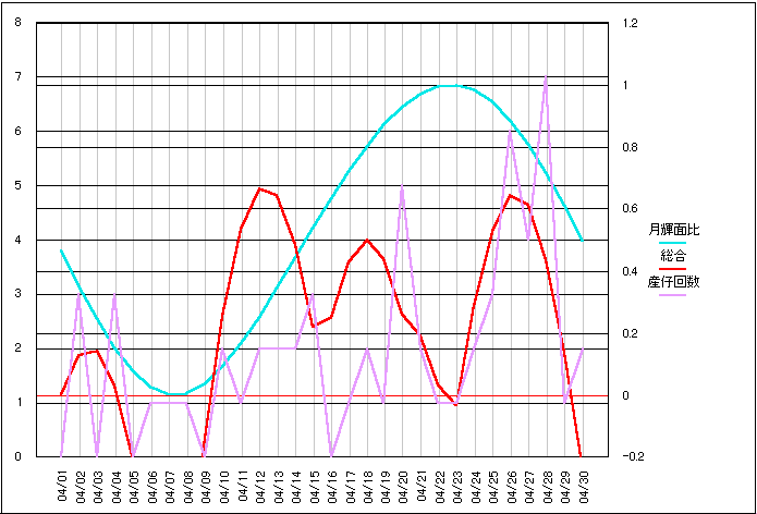 月と地球の距離変化を平均距離比率として比較。 中旬に地心距離が遠地点を迎えるために危険度が低くなっています。 単一の要素では産仔状況と関連は全く見られません。 |