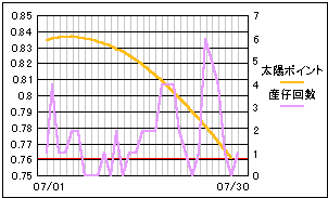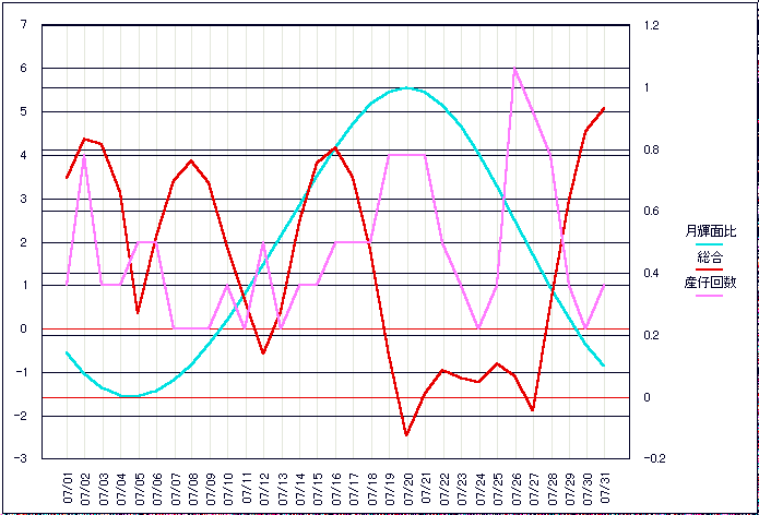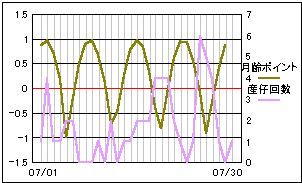 月齢の1/4周期毎に数値化したポイント値と比較。 当月は特に月齢周期とも、はっきりとした影響は見えてきません。 他の月と対照的に関連が全く見られません。 |