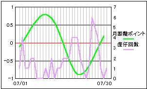 太陽と地球の距離変化を平均距離比率として比較。 当月上旬に遠地点を迎え、以後接近を始めます。 単一要素だけでは産仔数とは一致していません。 |