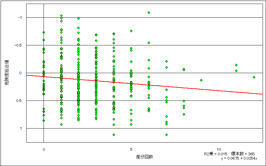 極端な例ですが、危険度が高いときに産仔数が増加する場合には、上のようなグラフになります。