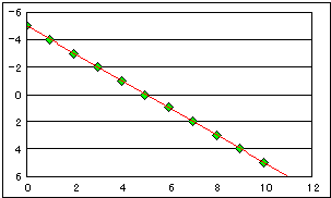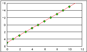 回帰分析の結果は右下がりの回帰線が描かれます。 サンプルですのでデータ点は完全に回帰線と一致しています。 | |||||||||||||||||||||||||||||||||||||||||||||||||