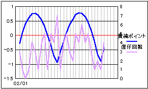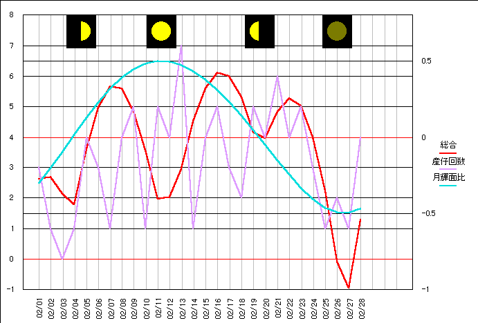 当サイトの危険度グラフの算出項目の変更から、昨年10月分から当ページでも月齢ポイントを位相ポイントに変更しました。 基本的には月齢の1/4周期毎に数値化したポイント値と変わりません。 より輝面比(満ち欠けの様子)に忠実になります。 大まかに4つの谷と一致しているようにも見えますが、はっきりとした影響は現れていないようです。 |