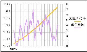 太陽と月の黄緯差を数値化したポイントと比較。 高緯度の差が少ないときに産仔回数も減少しているようにも見えます。 やはり、単一要素だけでは明確な相関は見られないようです。 |