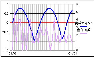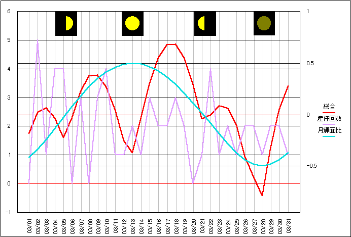 当サイトの危険度グラフの算出項目の変更から、昨年10月分から当ページでも月齢ポイントを位相ポイントに変更しました。 基本的には月齢の1/4周期毎に数値化したポイント値と変わりません。 より輝面比(満ち欠けの様子)に忠実になります。 大まかに4つの谷と一致しているようにも見えますが、はっきりとした影響は現れていないようです。 |