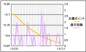太陽と地球の距離変化を平均距離比率として比較。 上旬に最遠を迎え月末に向け近づいています。 見た目には何となく相関があるようにも見えますが、やはり単一要素だけでは、完全に産仔回数とは一致していません。 |