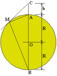 左の図で、目の位置をC、目の位置から月表面に引いた接線をCMとすれば、CMが地平線までの距離となります。 Cと月の中心Oを結ぶ直線が月表面と交わる点をA,Bとすると