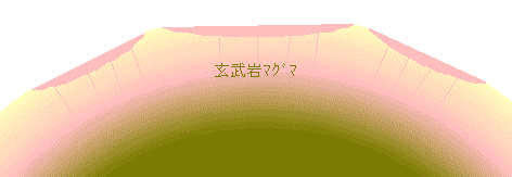 ベイスンの形成から数千万年から数億年後の、創世期のマグマの海から冷え固まった深さ数百kmの部分では、カリウム、ウラニウムなどの放射性元素の崩壊熱が蓄積して、岩石の一部が溶け始めました。 しかし、十分な熱がなかったために層全体が溶けたのではなく、低温でも溶けやすい成分だけが溶融して、玄武岩質マグマが発生して行きます。 |