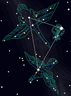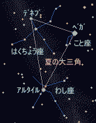 夏の夜空にめだつ3つの星座の明るい星を結ぶと大きな三角形ができ、これを「夏の大三角形」と呼びます。 はくちょう座α星デネブ(1.3等)、こと座α星ベガ(織女星:0.0等)、わし座α星アルタイル(牽牛星:0.8等)の3つの星からなります。