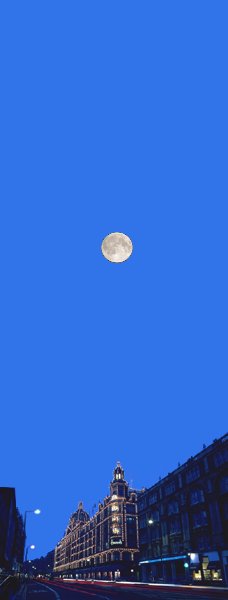 一方を隠しながら交互に見比べるとわずかですが地平拡大が感じられます。 地上風景・月の大きさは全く同じです。空の色は単色塗りにしてあります。 |