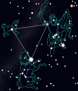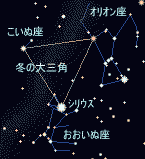 冬の夜空にめだつ3つの星座の明るい星を結ぶと大きな三角形ができます。 これを「冬の大三角形」と呼びます。 オリオン座α星ベテルギウス(0.4等)、おおいぬ座α星シリウス(−1.5等)、こいぬ座α星プロキオン(0.4等)の3つの星です。