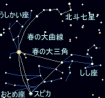 春の夜空にめだつ3つの星座の明るい星を結ぶと大きな三角形ができるます。 これを「春の大三角形」と呼び、うしかい座α星アルクトゥールス(0.0等)、おとめ座α星スピカ(1.0等)、しし座β星デネボラ(2.1等)の3つの星からなります。