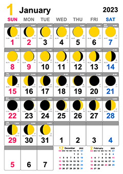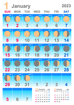 ムーンカレンダー2023は極めて正確な天文計算に基づき制作されています。一般に市販されている月齢カレンダーの殆どが月の満ち欠けを美しい配列になるよう加工して作成されています。
