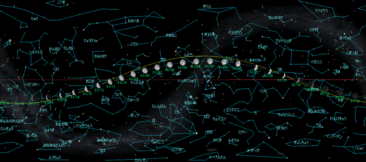 | 4 | 日 | 13.433 | 02時51分:月の赤緯が最北 15時36分:地球が近日点を通過(0.9683277AU) しぶんぎ座流星群(活動期間1/1〜1/5)が極大 |