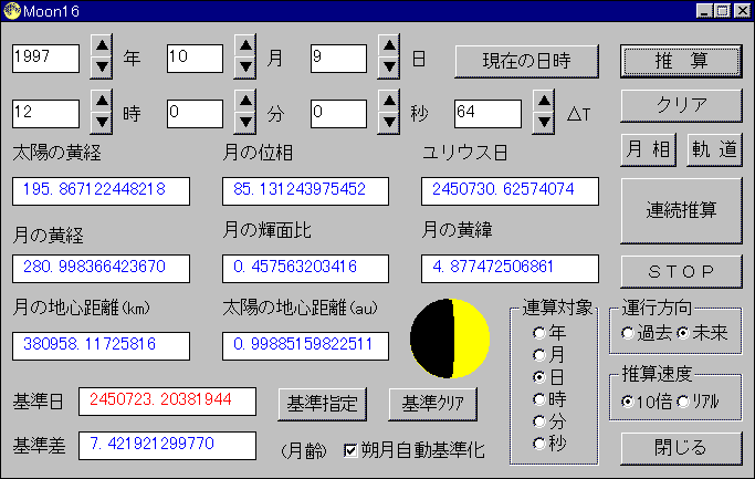 月の離角・輝面比・月齢等を秒単位で算出します。また、連続計算することが可能です。