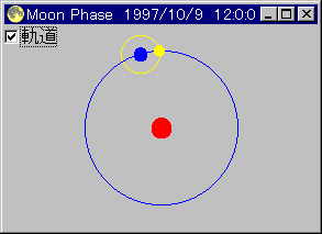 別窓の月相表示は拡大縮小可能です。月と地球の軌道表示機能を付け加えました。