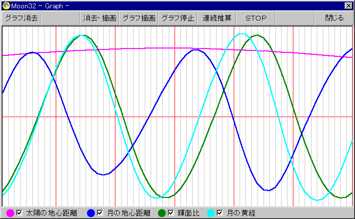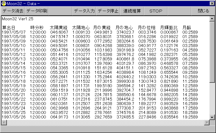 ●Moon32.exeはWindows95/NT用で月の離角・輝面比・月齢のほか