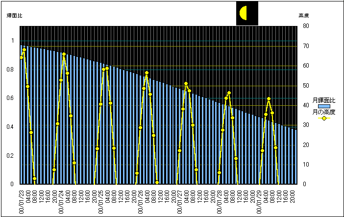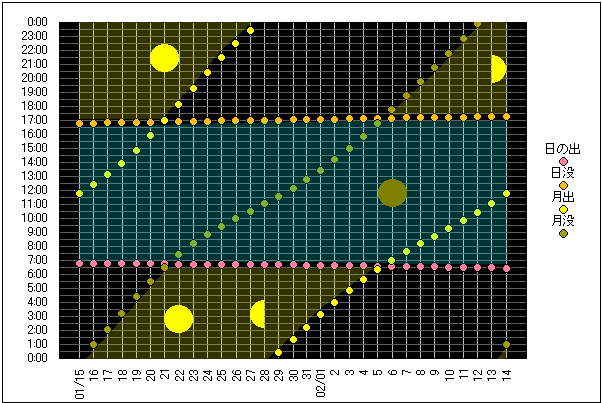 ![]() | 任意日時で月齢や月と太陽の位置や距離を算出します。 | |