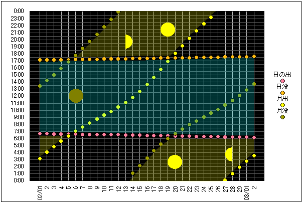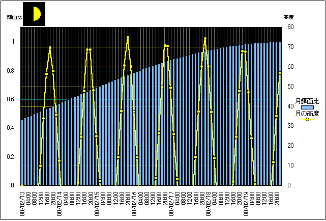 ![]() | 任意日時で月齢や月と太陽の位置や距離を算出します。 | |
