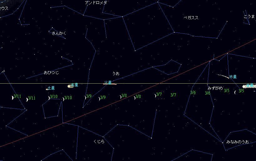 月が天の赤道を通過(11:47) 夕方の西空に火星・木星・土星と月の接近 |