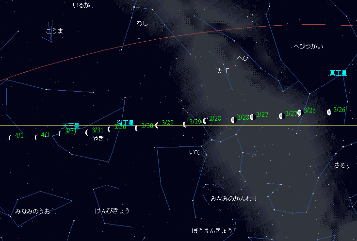 海王星が月の北0°39′に接近(18:51) 月が黄道を通過:黄緯0゜(09:05)降交点 |
