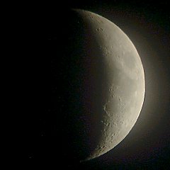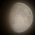 月齢9.764 輝面比80.86 377,083km 十日月 気温17.3度 真綿の中にくるまっているかのように、柔らかな光は夜空に吸い込まれて行きます。 天候悪化の予報の通り、夜空は次々と押し寄せる雲に覆われて行きます。 儚いまでの月光は雲の層を越え、かろうじて私たちの網膜へと届いているようです。 |