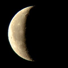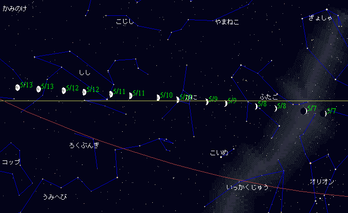 大型連休には、ゆっくりと星空を楽しんでこられた方も多いことと思います。 故郷で眺める夜空は、ネオンや街灯でかき消された都会の空とは比べものにならないほど、星々が大きく瞬いているように、見えたことと思います。 残念ながら月は朔を迎えていましたので、闇夜となってしまいましたが、水瓶座流星群や星座を心ゆくまで楽しむことが出来たのではないでしょうか。 連休明けからは、日没後の西空に細い月が迎えてくれることでしょう。 心身共にリフレッシュして、新たな気持ちで日々の生活に取り組ん行けるよう願っています。 最近を迎えた月は、上弦前に大きな姿を見せてくれることと思います。 沈み行く月が、赤く大きく見え、少々不吉な気配を漂わせることになりますが、これから夏に向けて輝きだしたばかりの月を見るのには最適な季節になって行きます。 満ち始めたばかりの月を代表するものとして、三日月が有名ですが、なじみの深い三日月は私たちのイメージの中では、比較的はっきりとした印象をして捉えられていることが多いようです。 そもそも、三日月は「朏」(ひ)と書いて「みかづき」と読み、姿が初めて見え出した月を表す言葉が語源となっています。 また、三日月の鋭い形から霊力があると思われていたようです。