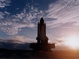 打ち上げ場に向けてゆっくりと移動するステージは、超大型のトラックです。 およそ30トンのシャトルを打ち上げるために必要な、約750トンの外部燃料タンクと、590トンの固体ロケット2台を支えることができるように作られた、地上最大級の乗り物です。 画像サイズは600×480と1024×768ピクセルの2種類を用意しています。 |