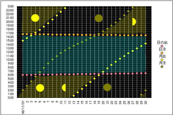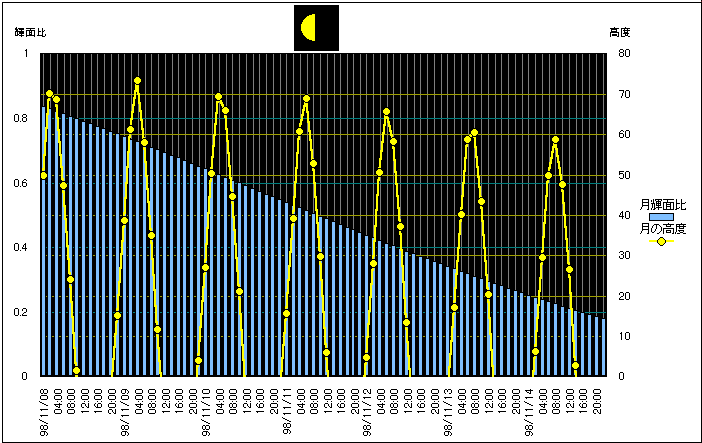 ![]() | 任意日時で月齢や月と太陽の位置や距離を算出します。 | |