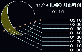![]() 月齢24.26 輝面比24.8%(01:30) 出現時刻は01:58 月高度7度 |