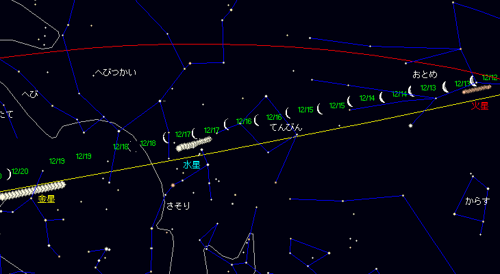 | 17 | 木 | 27.94 | 2 | 水星が月の南2゜29’に接近(10:14) | 羽子板市(浅草寺)〜19 | 10/29 | |