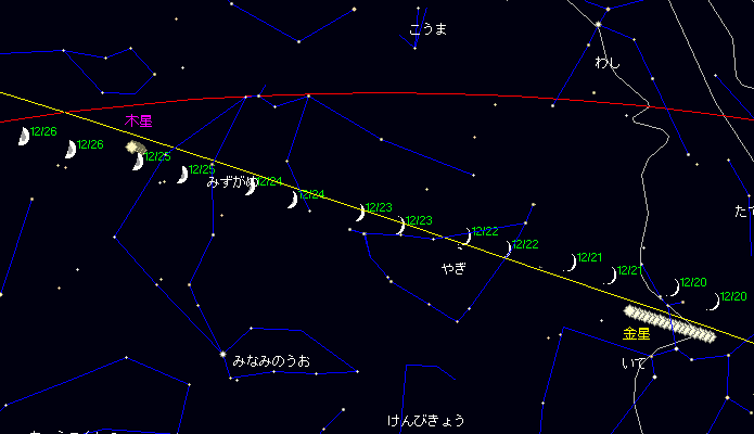 | 25 | 金 | 6.17 | 8 | ![]() | 木星が月の北1゜08’に接近(20:22)海外で木星食 | クリスマス | 11/7 |