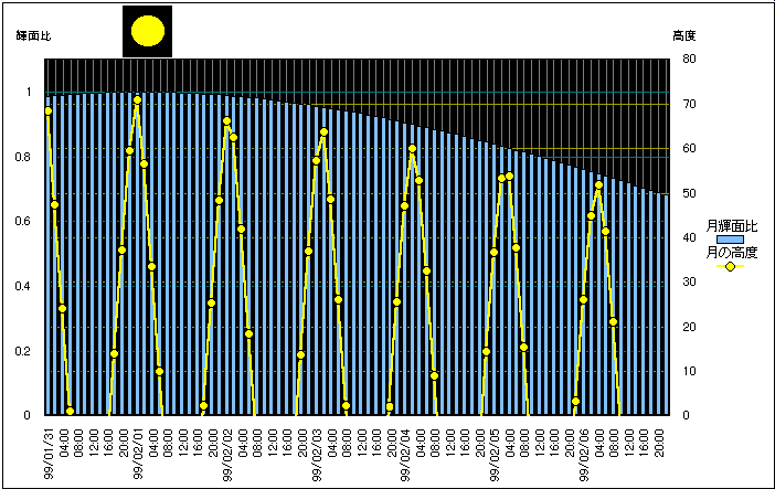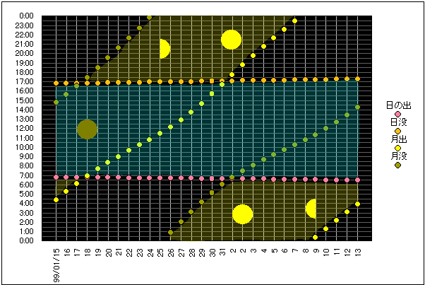 ![]() | 任意日時で月齢や月と太陽の位置や距離を算出します。 | |