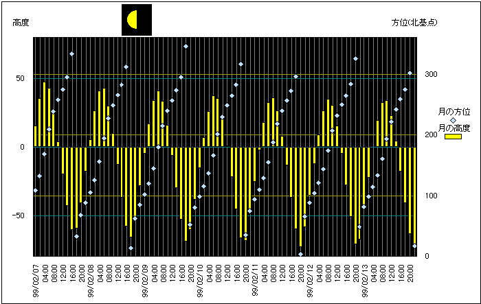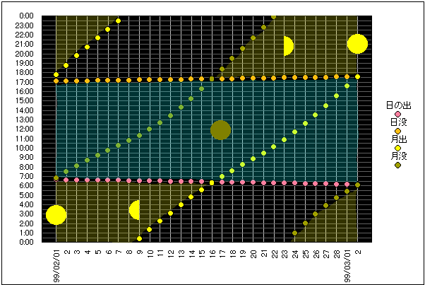 ![]() | 任意日時で月齢や月と太陽の位置や距離を算出します。 | |