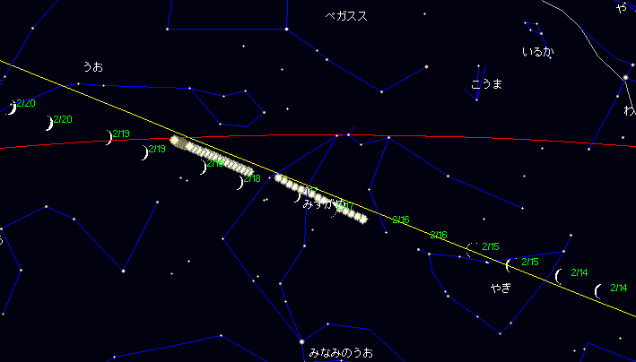 ![]() ![]() | 木星が月の北2゜13’に接近(02:14) |