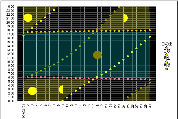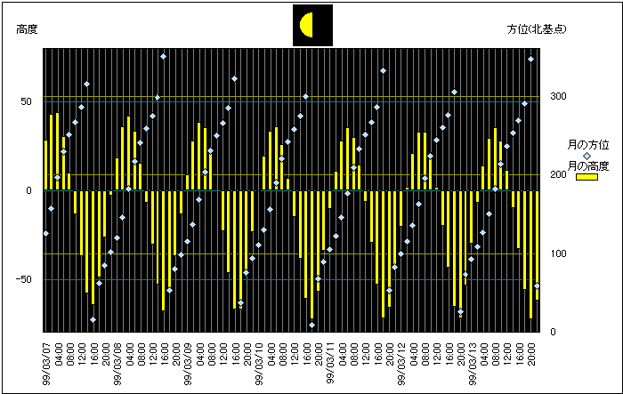 ![]() | 任意日時で月齢や月と太陽の位置や距離を算出します。 | |