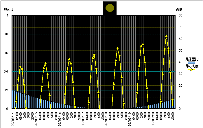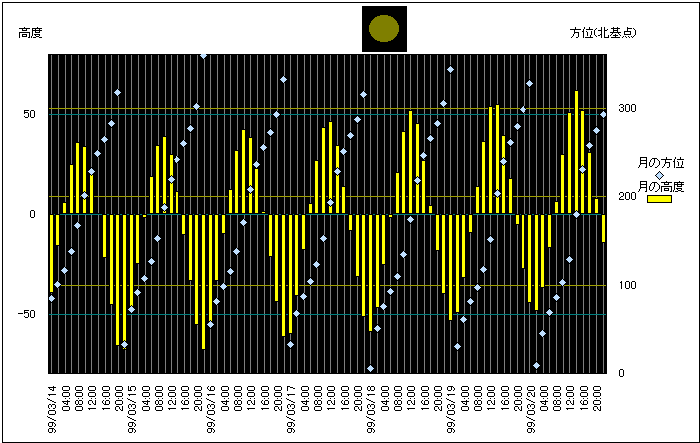 ![]() | 任意日時で月齢や月と太陽の位置や距離を算出します。 | |